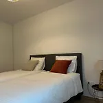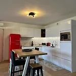 The apartment includes a fully equipped kitchen with climate control and a washing machine for utmost comfort.